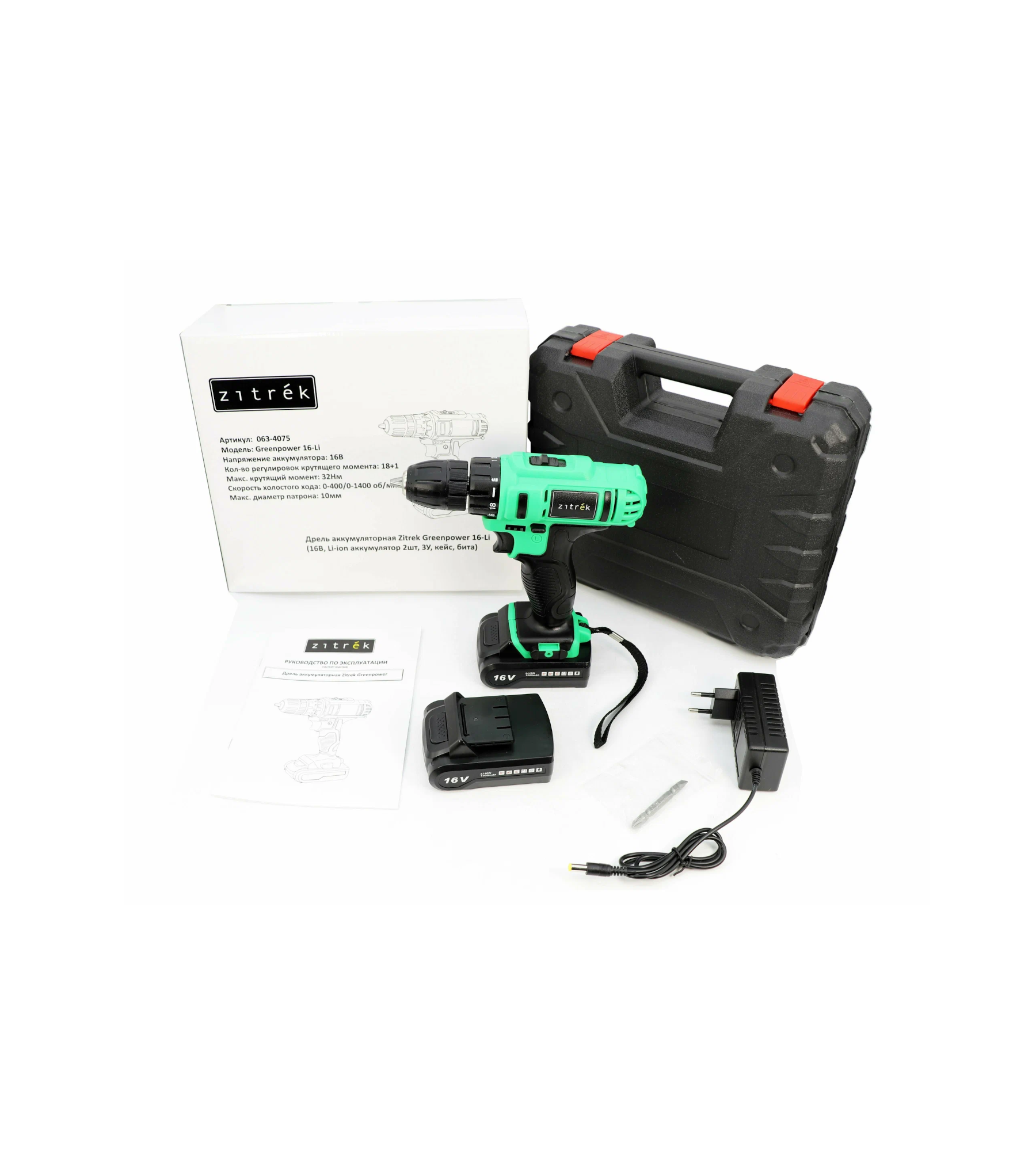 Дрель аккумуляторная Zitrek Greenpower 16-Li { 16В, Li-ion аккумулятор 2шт, ЗУ, кейс, бита }