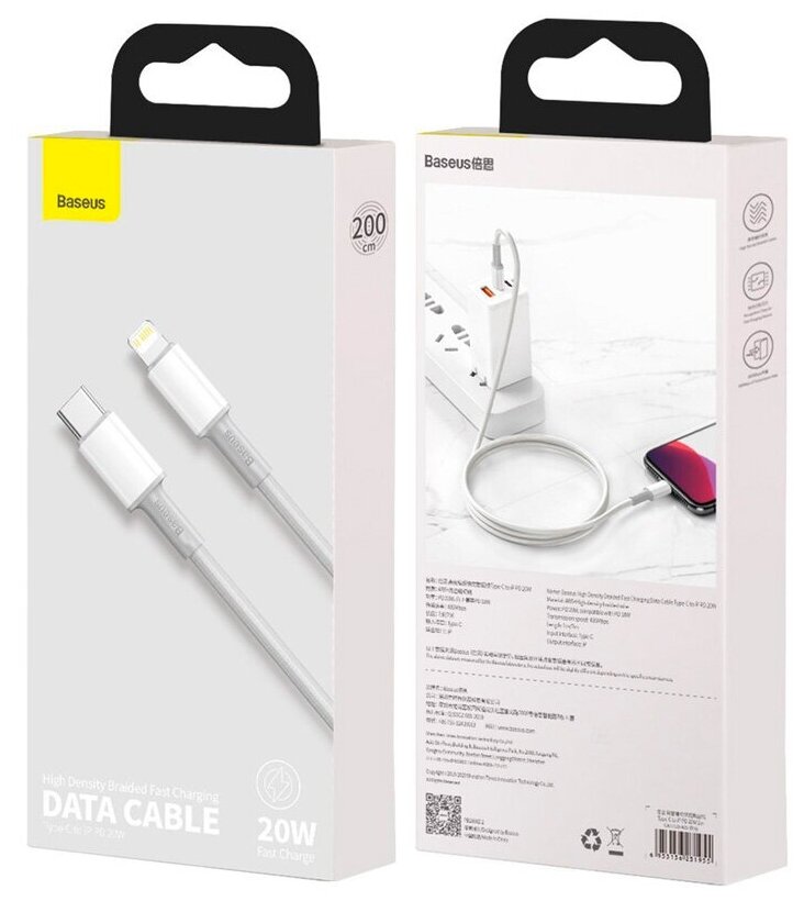 СохранитьКабель USB-C BASEUS High Density Braided, Type-C - Lightning, 20W, 2 м, белый (CATLGD-A02) интересное: