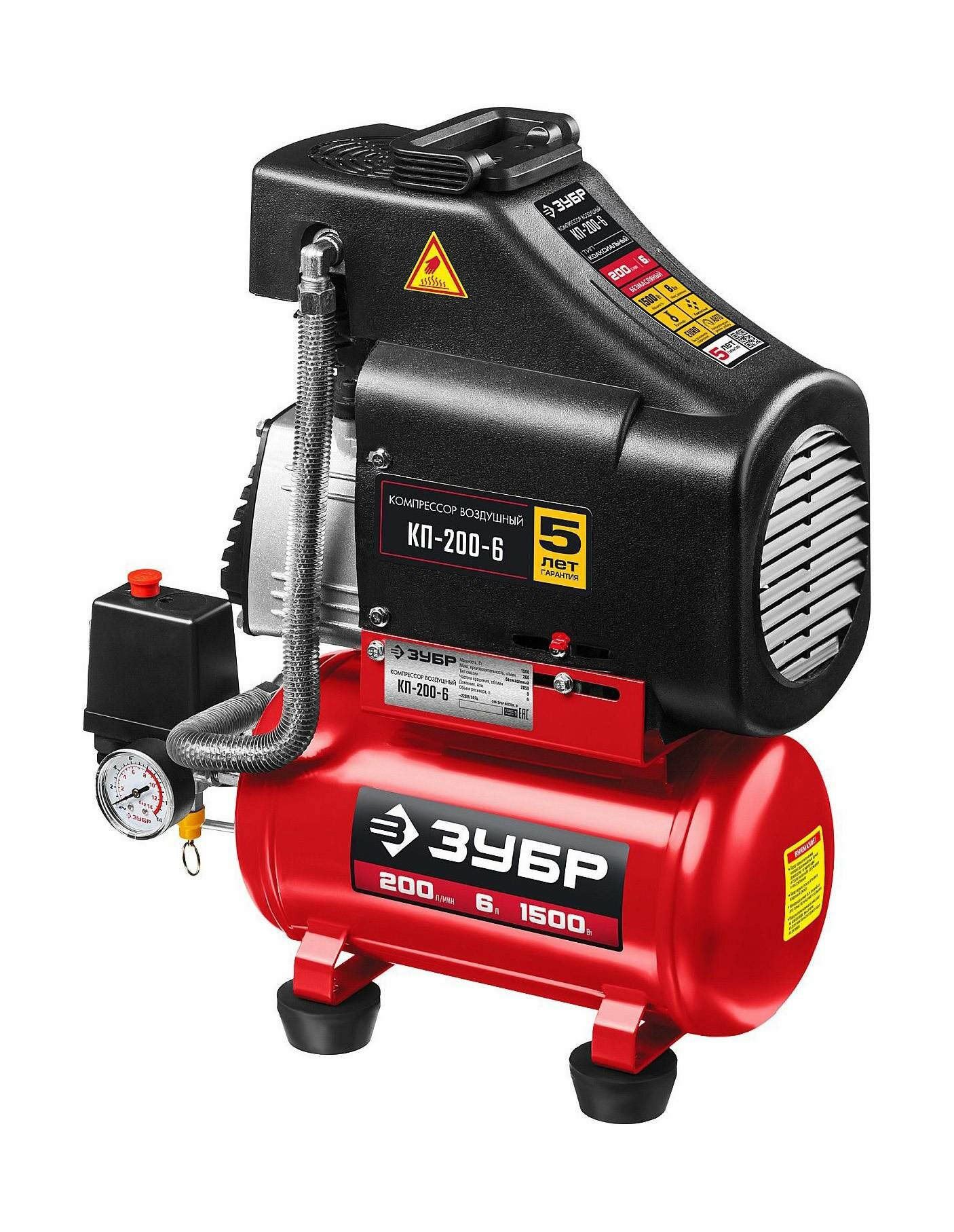 ЗУБР КП-200-6 Н6, набор аксессуаров, 200 л/мин, 6 л рессивер, 1500 Вт, безмаслянный компрессор воздушный