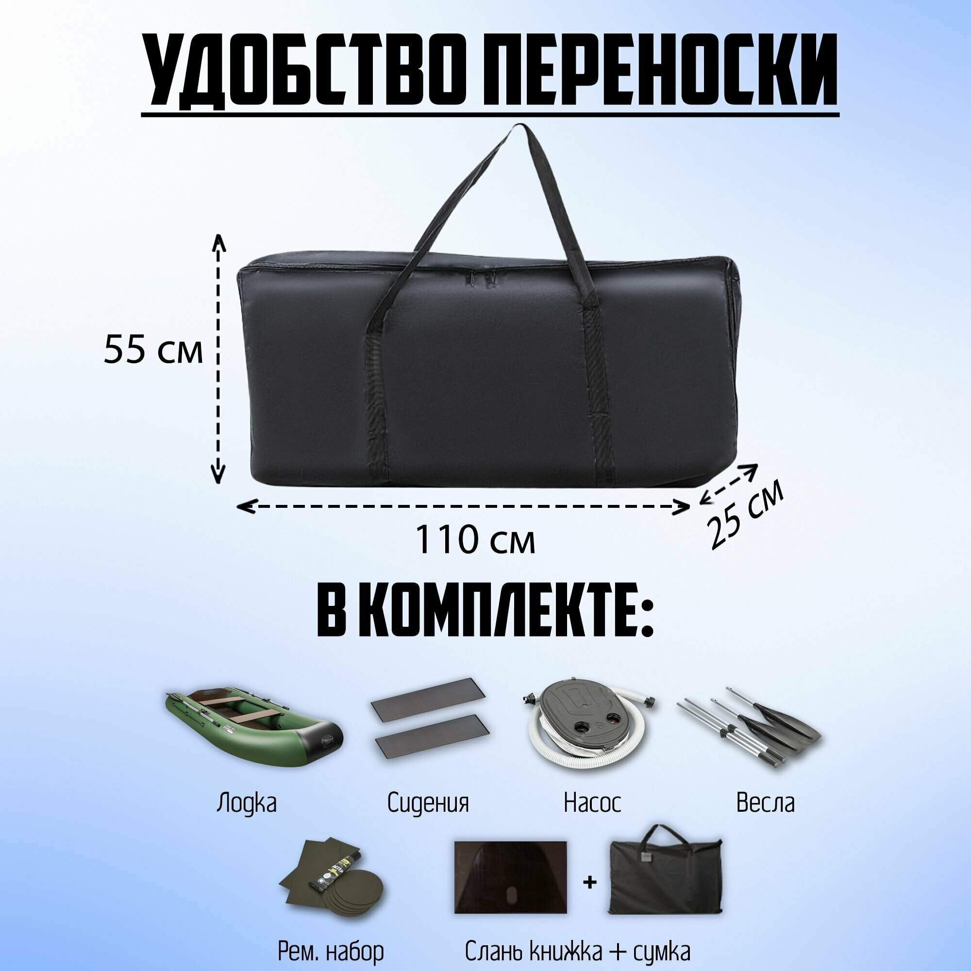| Состав набора | Лодка, слань-книжка, 2 сидения, 2 весла разборных, ножной насос 5 литров, рем.комплект, сумка для лодки, сумка для слани |