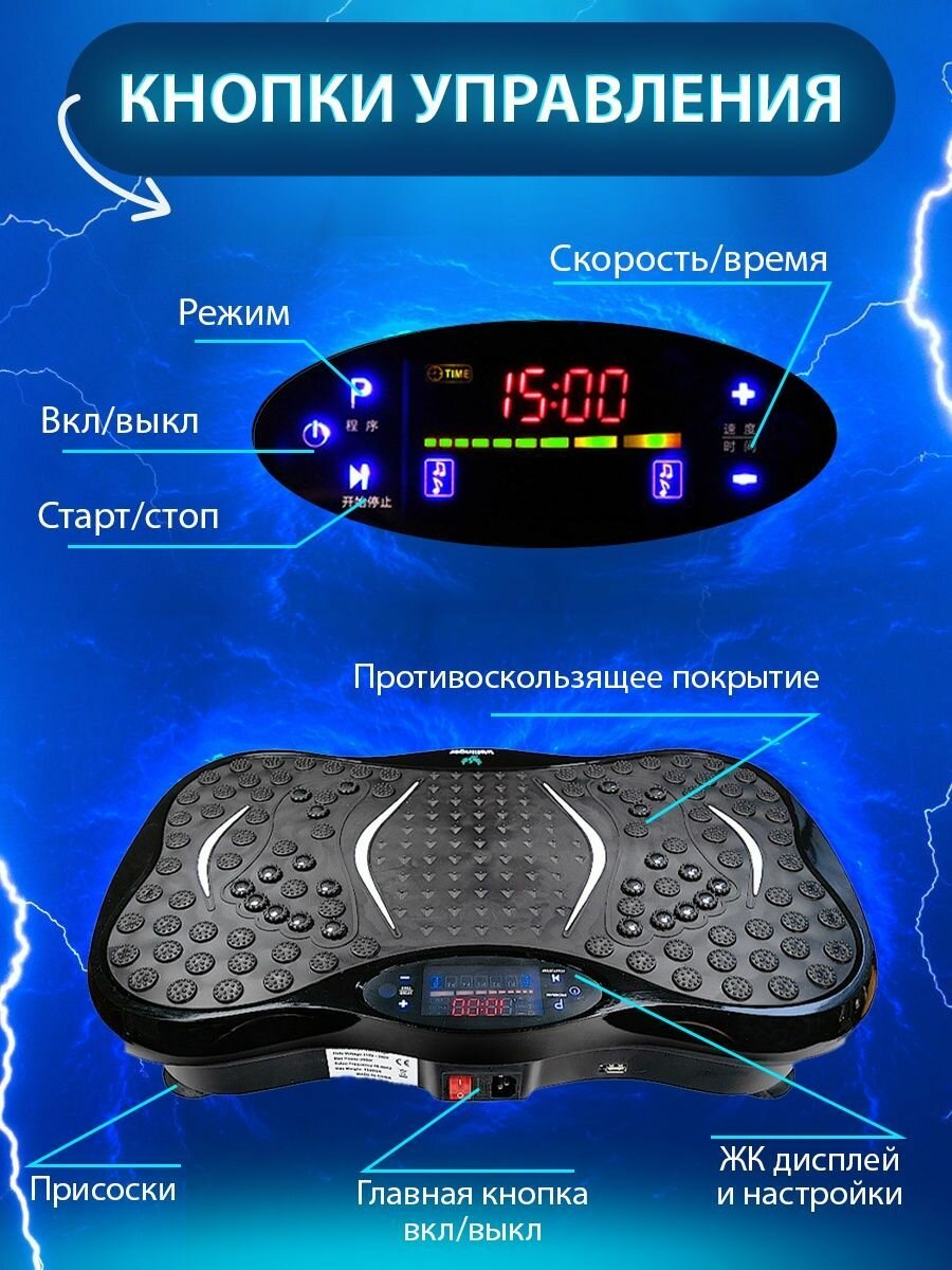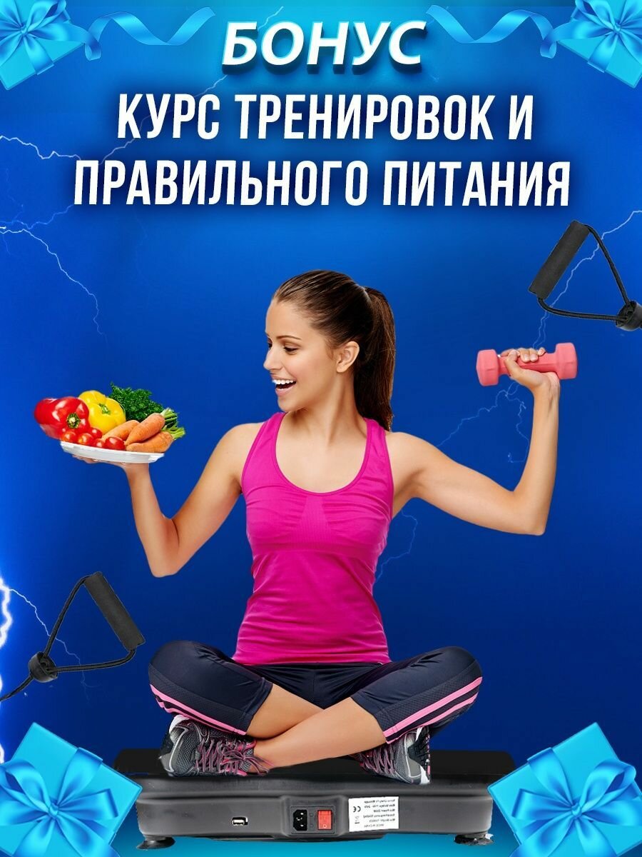 | Подробная комплектация | Инструкция - 1 шт.; Шнур питания - 1 шт.; Виброплатформа - 1 шт.; Пульт управления - 1шт.; Эспандеры - 2 шт.; QR-код с курсом правильного питания - 1 шт. |
