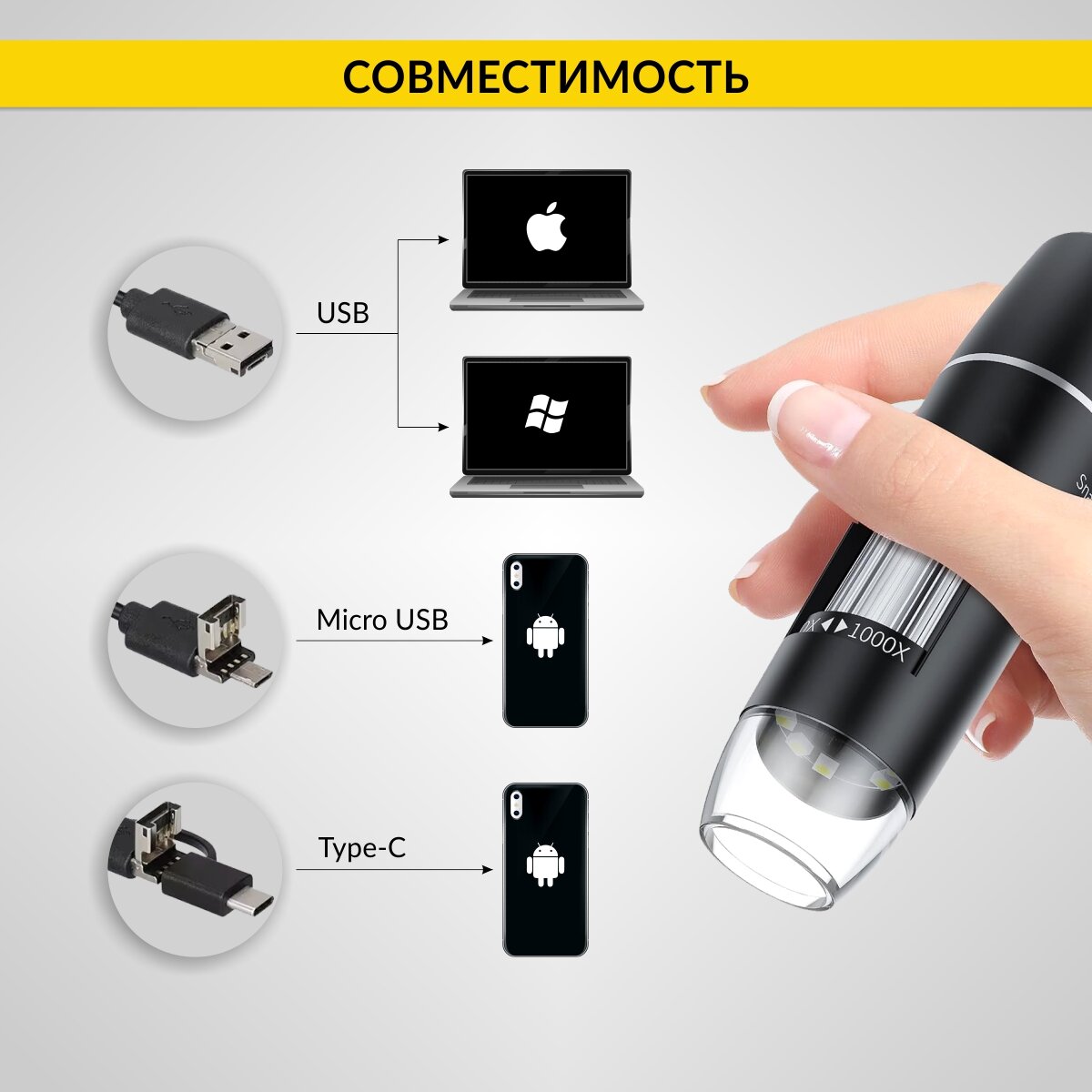Микроскоп USB, 2Мп, 1000X, 1920x1080, 1.5м, USB/Micro USB/TypeC iCartool IC-V317