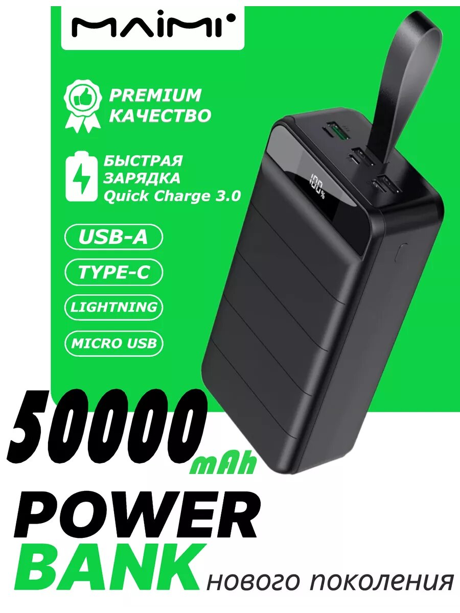 Портативный аккумулятор MAIMI MI9 50000 mAh, 3 выхода USB, Type-C, micro, black интересное: