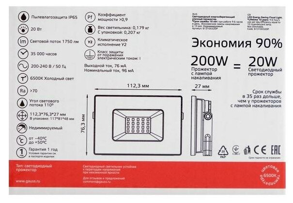 Прожектор светодиодный 20 Вт gauss 613100320P LED IP65 6500К 1320lm