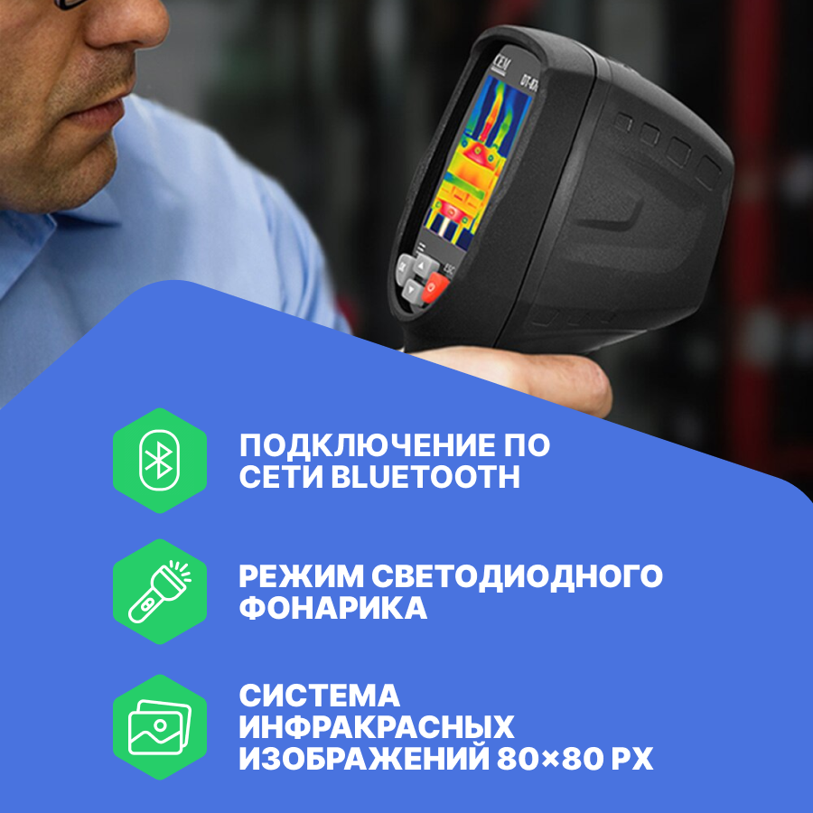 | Дополнительная информация | bluetooth BLE4.0, регистрация и передача данных тепловизора; автоматическое распознавание “горячих/холодных” областей, фонарик |
