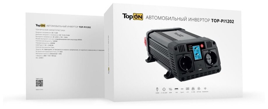| Комплектация | Автомобильный инвертор TopON TOP-PI1202 1200W 2 розетки, USB, Type-C, LCD экран, пиковая мощность 2400W Черный |
