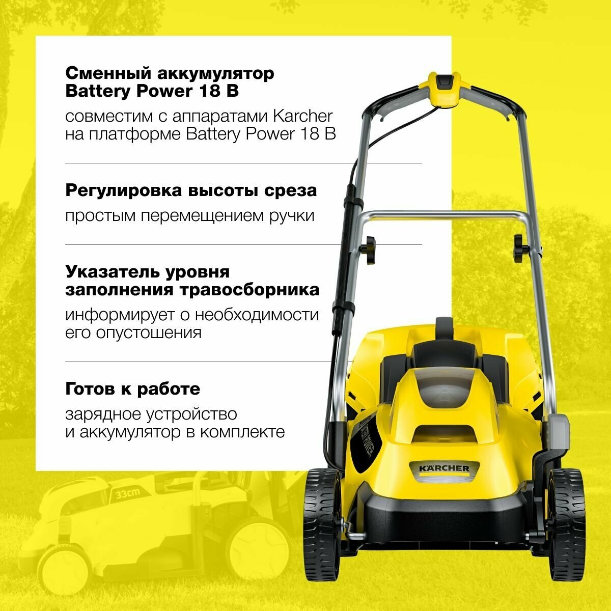 Газонокосилка аккумуляторная Karhcer LMO 18-33 Battery Set (аккумулятор в комплекте)
