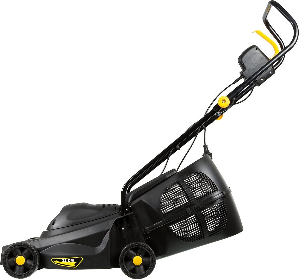 Отзыв: газонокосилка с шириной скашивания около 32 см. Выполнена из пластмассы, управлять можно даже одной рукой. Идеальный вариант для тех, кто не знаком с подобной техникой и хочет опробовать агрегат на небольшом участке на придомовой территории. Стоит иметь в виду, что далеко с ней не уедешь, так как она электрическая. И чтобы косить дальше 10 квадратных метров нужно заморочиться с системой удлинителей. Но если брать непосредственно для небольших работ у дома, то справляется она отлично. Ножи острые, траву не жует, срезает ровно.