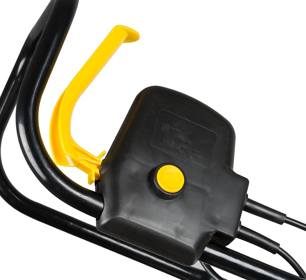 Плюсы: Однорежимная электрическая модель с большими колесами, съемным контейнером для работы на ровных небольших участках. Работает только от электросети. Система управления находится на ручке. Три регулировочные ступени глубины, высоты захвата, блокировка пускового рычага. Легкая, маневренная.