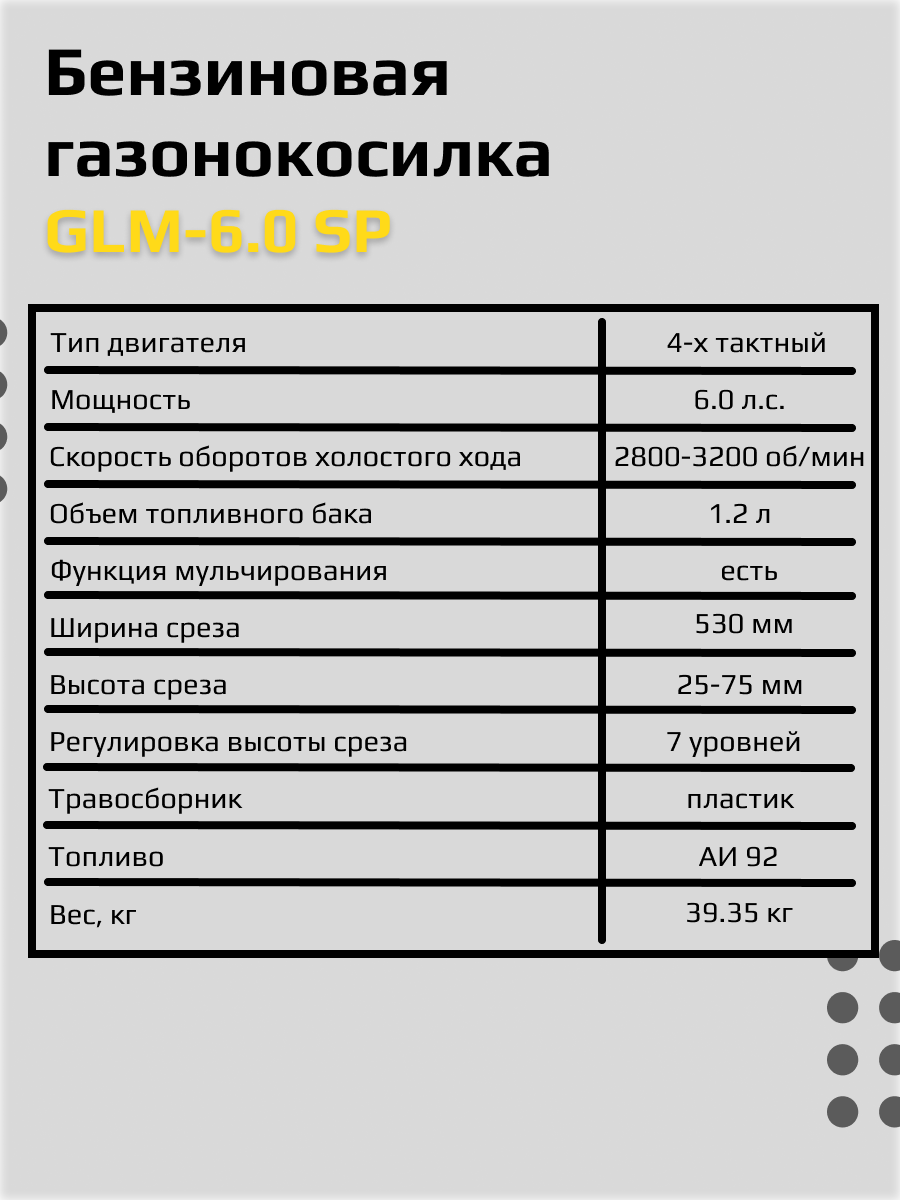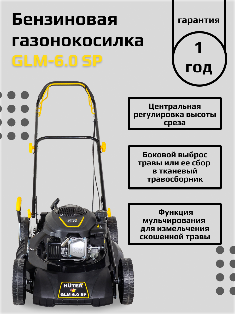 | Комплектация | , Преимущества Huter GLM-6.0 SP: самоходная конструкция для простоты обработки; мощный и производительный двигатель; металлический корпус, устойчивый к механическим повреждениям; наличие складной рукоятки в комплекте; нож выполнен из высокопрочной и устойчивой к коррозии стали; боковой выбрас травы; вместительный пластиковый травосборник 65 литров. |