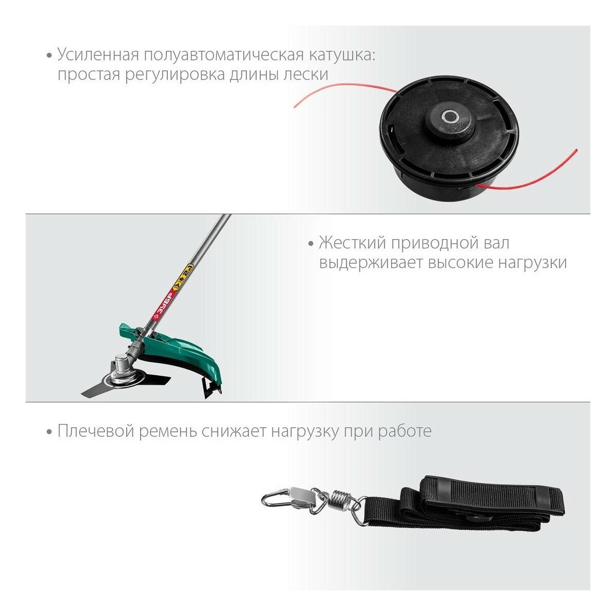| Подробная комплектация | коса, кожух защитный, катушка с леской, нож, плечевой ремень, рукоятка дополнительная с крепежом, ключ, руководство по эксплуатации |