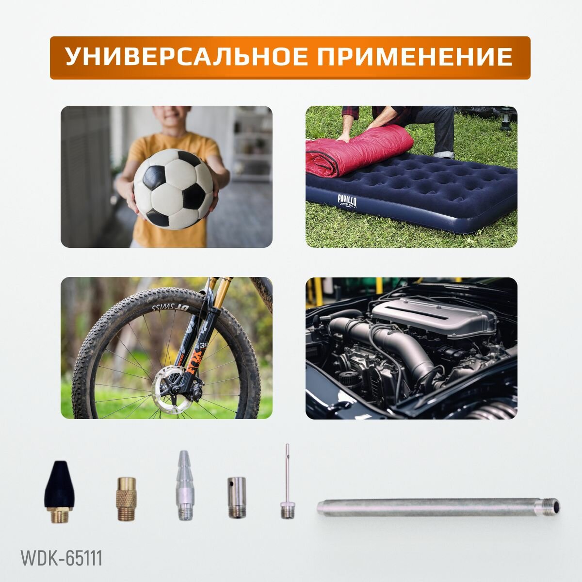 Пневматический обдувочный пистолет с набором аксессуаров для накачки мячей, колес и обдувки деталей WIEDERKRAFT WDK-65111