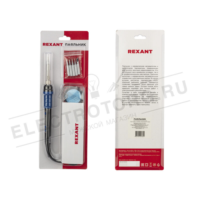 Паяльник для пайки проводов Rexant электрический керамический с аналоговой регулировкой температуры, набор комплект из 5 жал с подставкой