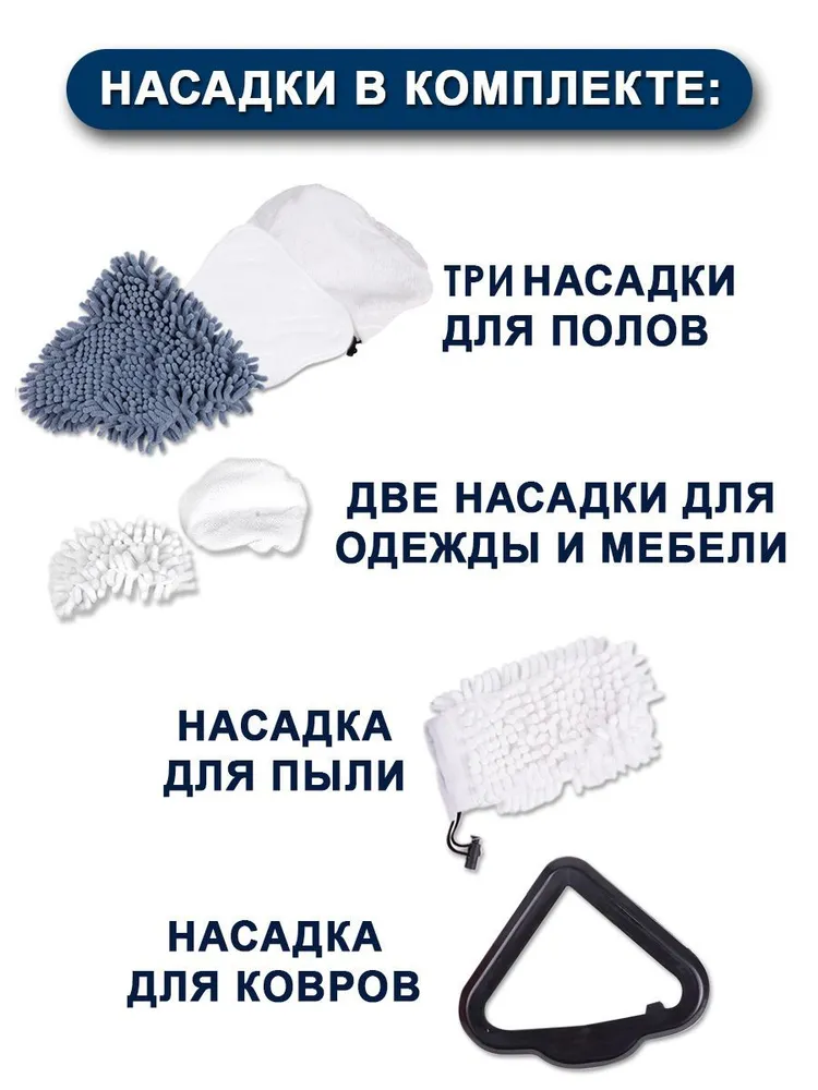 | Дополнительная информация | 1*паровая швабра, 1*оконный ракель/отпариватель одежды, 2* круглых щетки разного размера для чистки, 2*треугольных насадки-щетки, 1*угловая насадка, 1*насадка для очистки швов, 1*насадка скребок, 1*нейлоновая насадка, 2*ткань для отпаривания одежды, 2*тканевая насадка для пола,1насадка+ткань для удаления пыли, 1*мерный стакан для воды, 1*инструкция |