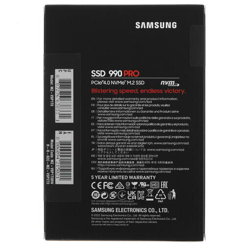 Твердотельный диск Samsung 990 PRO 1TB M.2, PCI-E 4.0 x4, TLC 3D NAND [R/W - 7450/6900 MB/s] /EU MZ-V9P1T0BW
