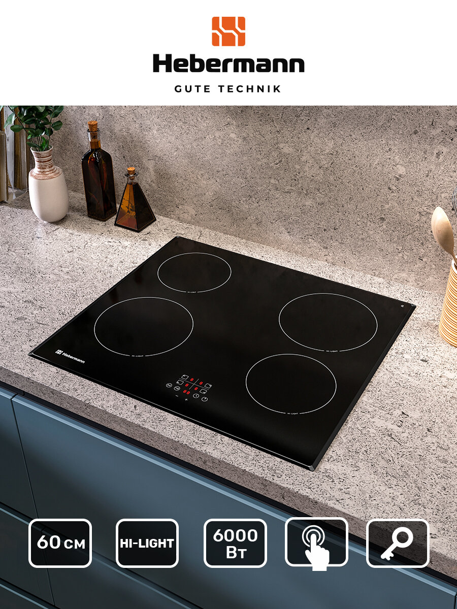 Электрическая варочная панель Hebermann HBKC 6040.1 BL, 60 см, встраиваемая, Защита от перегрева, Индикатор остаточного тепла, Кнопка блокировки панели, Отключение при выкипании, Функция Stop&Go Таймер конфорок