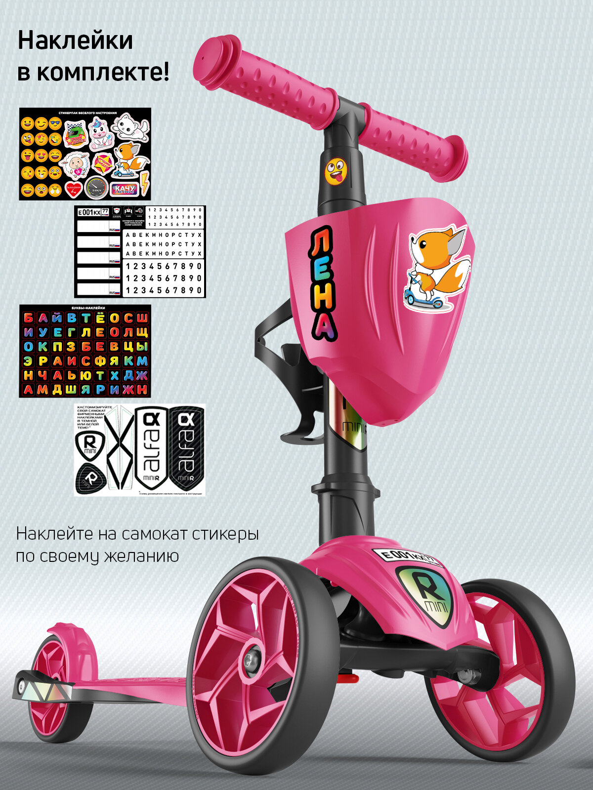 Самокат детский трехколесный с корзинкой, подстаканником для бутылок и наклейками