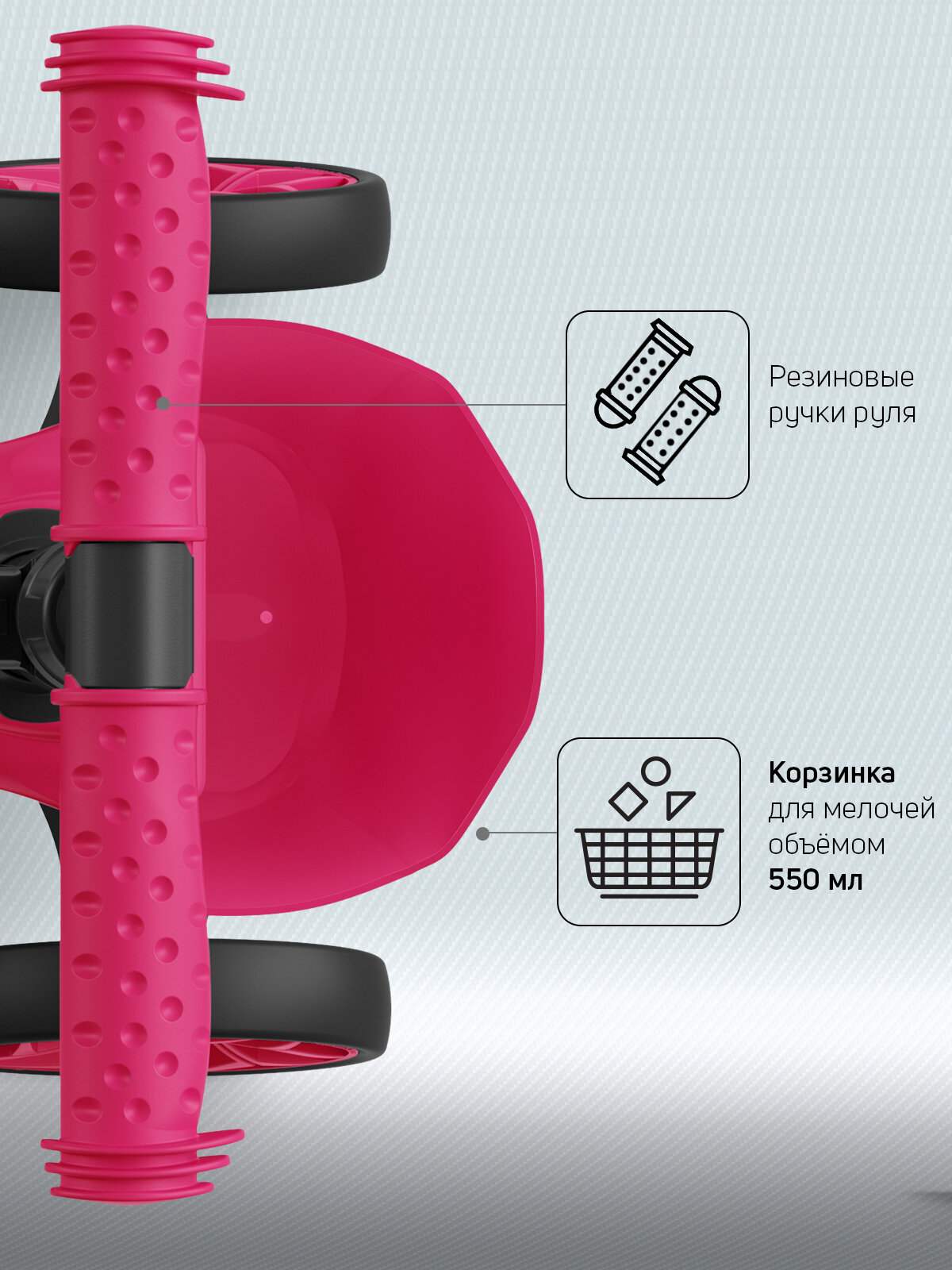 Очень лёгкий, но прочный! Цвет нежно розовый, красивый, спокойный. Корзина очень удобная для игрушек, а вот держатель для бутылки не понравился ребенку, пока не удобно с ним ездить, но думаю потом привыкнет. По ламинату и кафелю дома ездит бесшумно. |