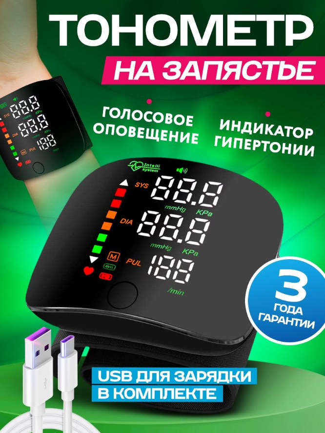 Цифровой автоматический тонометр на запястье, зарядка USB. интересное: