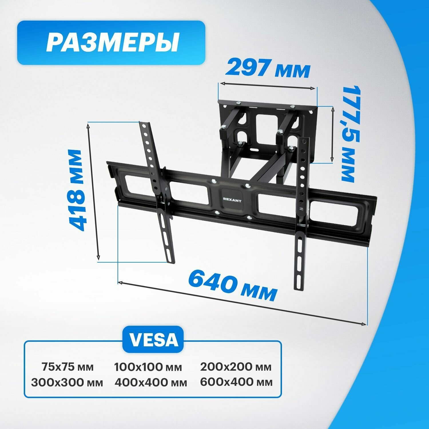 Купить Кронштейн для телевизора настенный поворотный 37-70 дюйма REXANT, двойное колено , крепления в комплекте