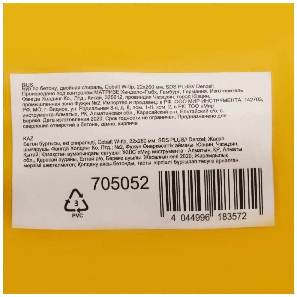 Бур по бетону, двойная спираль, Cobalt W-tip, 22x260 мм, SDS PLUS, DENZEL 705052