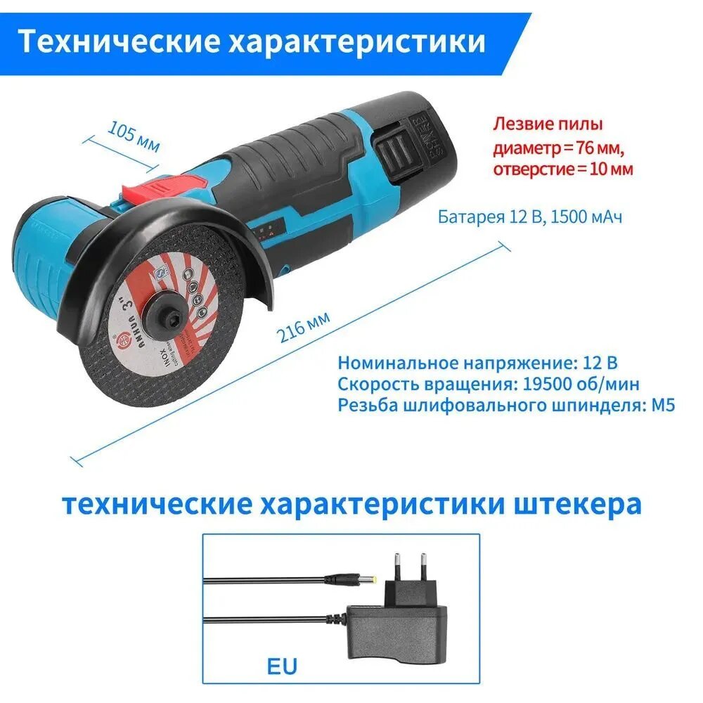 | Комплектация | аккумулятор 1шт; зарядное устройство 1шт; углошлифовальная машина - 1шт; отрезной алмазный диск 2шт |