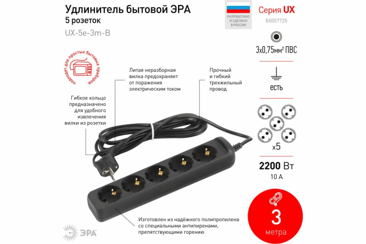 Эра Б0057725 Удлинитель электрический UX-5e-3m-B с заземлением 5 розеток 3 м ПВС 3х0,75мм2 10А черный