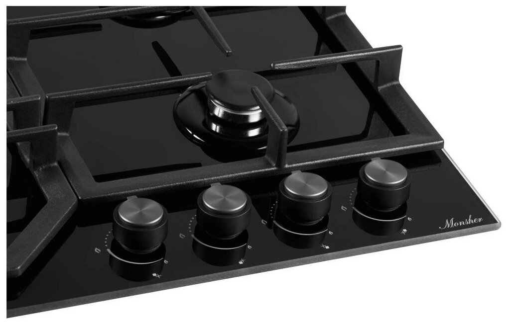 Купить Варочная панель газовая встраиваемая Моншер MGG 60 Noir закаленное стекло черный 40х610х510мм 4 конфорки 2 решетки электроподжиг / газконтроль /