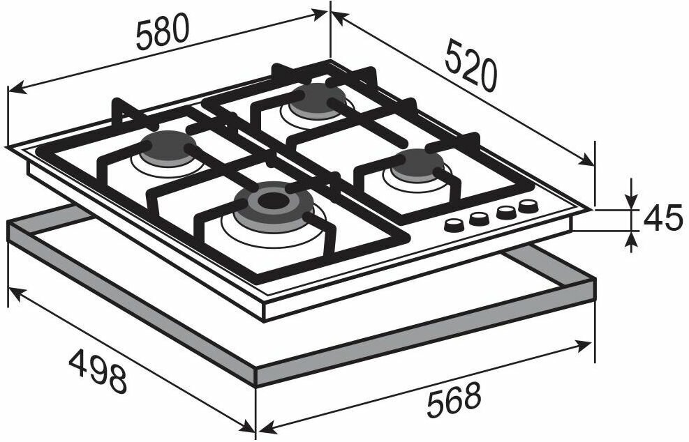 | Размеры конфорок | подставка для WOK горелки; подставка для кофейника; переходник для газа G30/30mbar; подсветка ручек при работе |