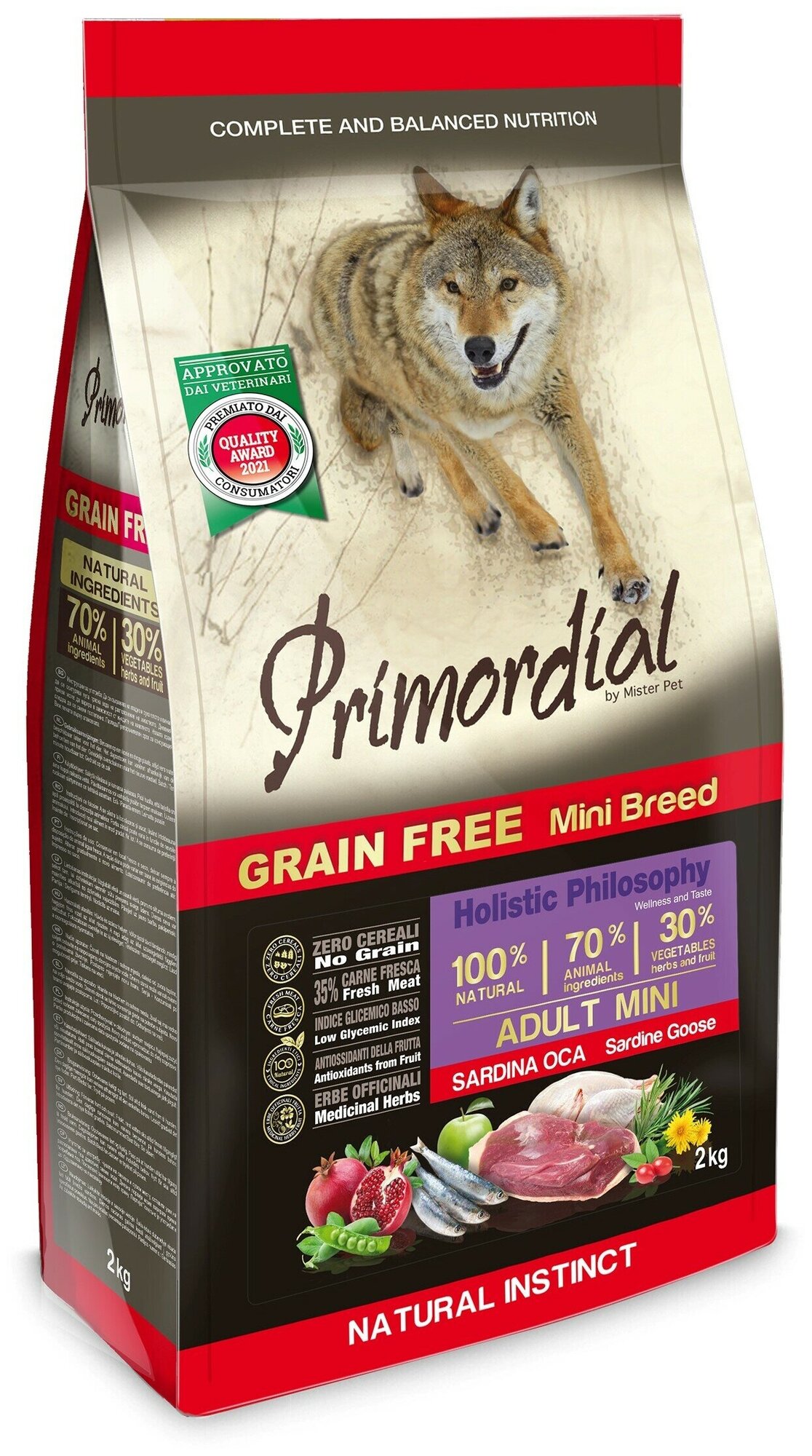 PRIMORDIAL ADULT MINI BREED беззерновой для взрослых собак маленьких пород с сардиной и гусем (2 кг)