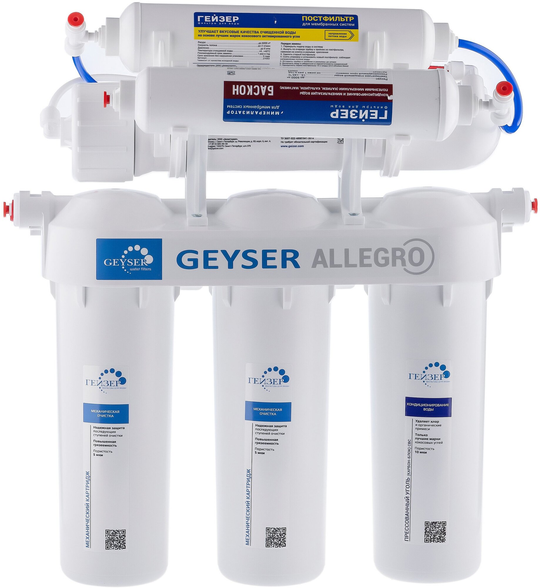 Система обратного осмоса Гейзер Аллегро М, глубокая очистка воды от различных примесей, включая бактерии и вирусы, 20037