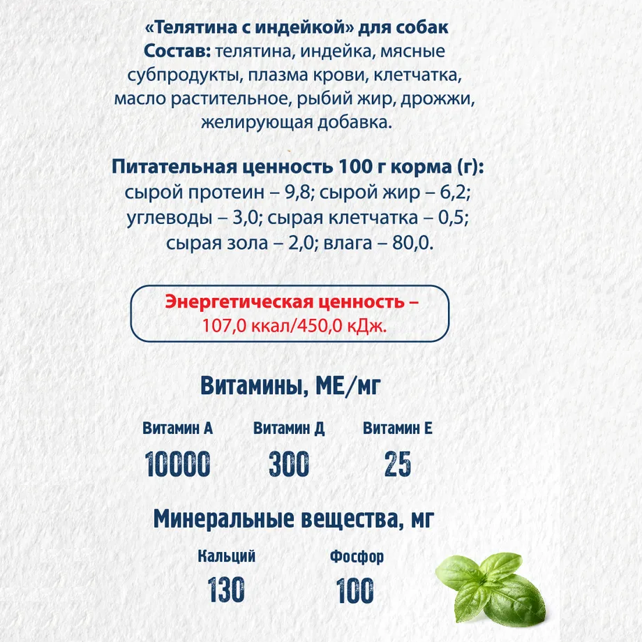 | Состав | телятина, индейка, мясные субпродукты, плазма крови, клетчатка, масло растительное, рыбий жир, дрожжи, желирующая добавка |