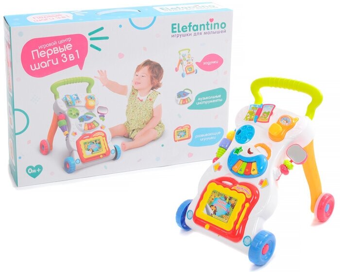 Детские ходунки-игровой центр 3в1 "Первые шаги" ELEFANTINO на батарейках с утяжелителем, пианино, доска для рисования, с контейнером