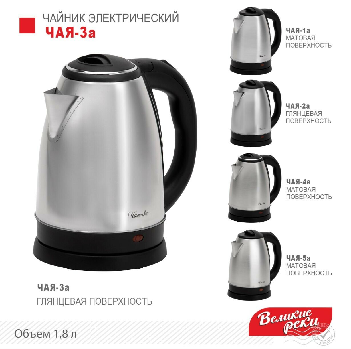 Чайник Великие реки "Чай-3А", 1,8л, 1500Вт, металл, бесцветный