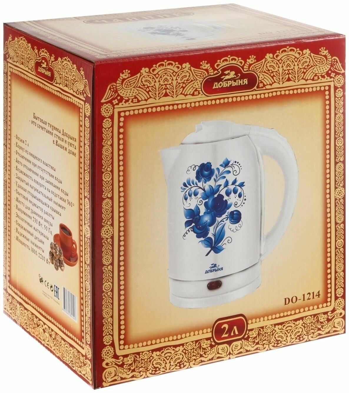 Добрыня Чайник электрический "Добрыня" DO-1214, металл, 2 л, 2000 Вт, белый с синими цветами