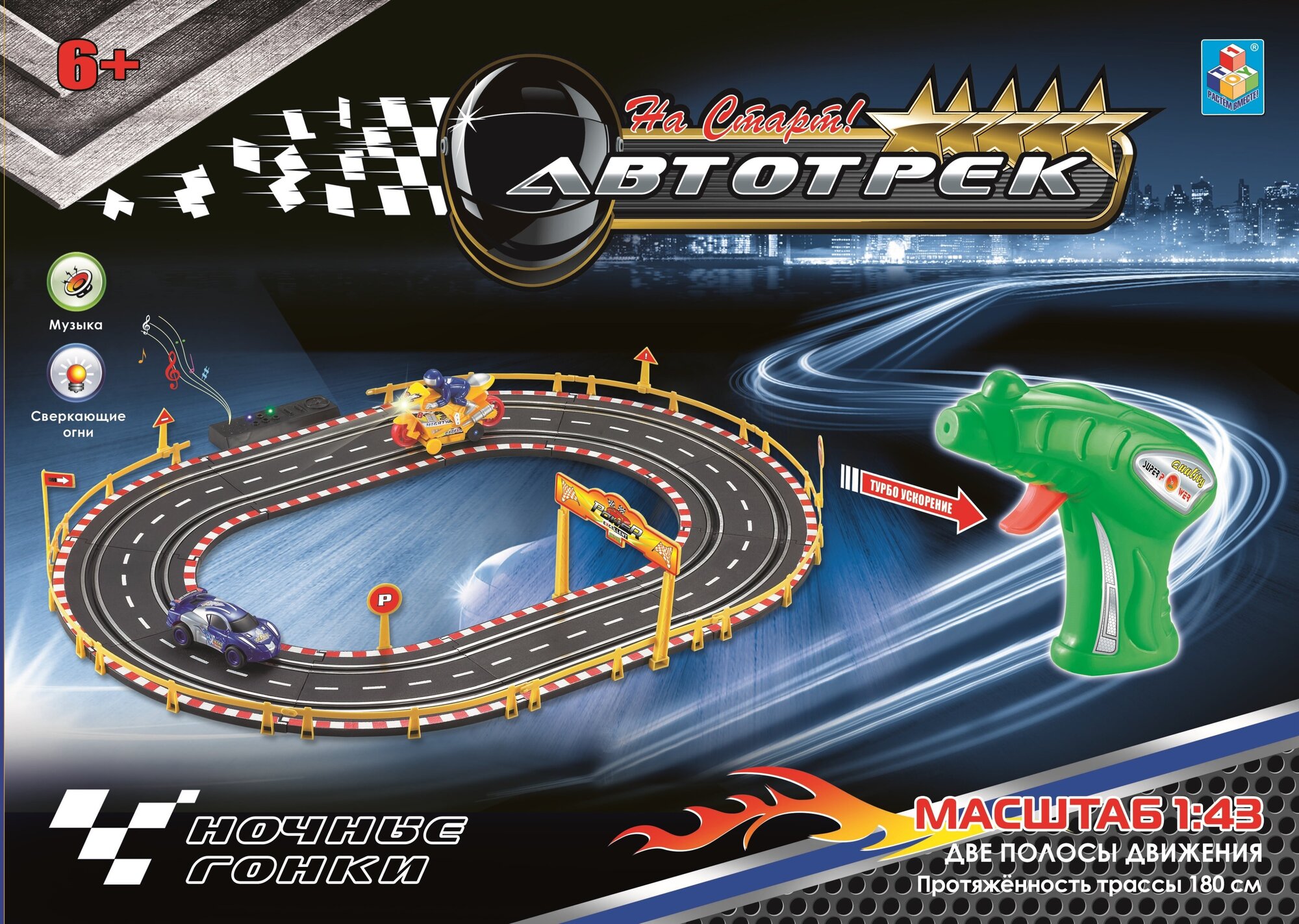 Автотрек 1Toy Ночные гонки с 2 машинками, 2 полосы движения, трасса 180 см