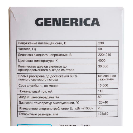 GENERICA LL-A60-20-230-40-E27-G Лампочка Нет