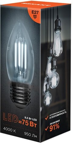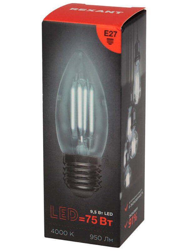 Лампочка филаментная REXANT Свеча CN35 9.5 Вт 950 Лм 4000K E27 прозрачная колба интересное: