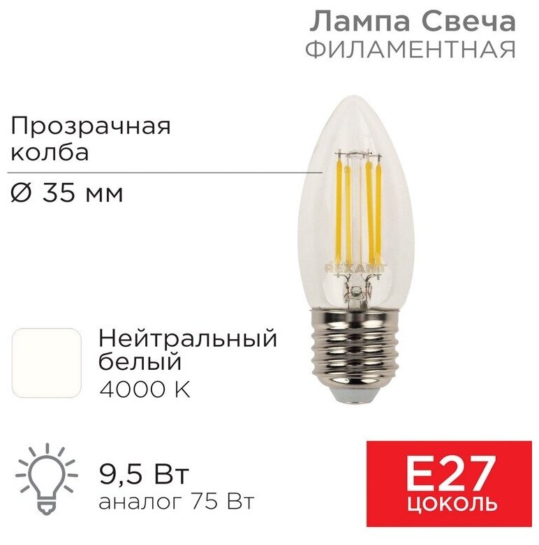 Лампа филаментная Rexant Свеча CN35, 9.5 Вт, 950 Лм, 4000K, E27 в прозрачной колбе