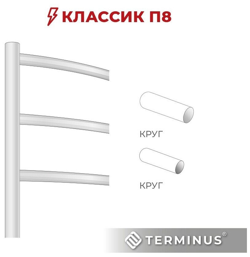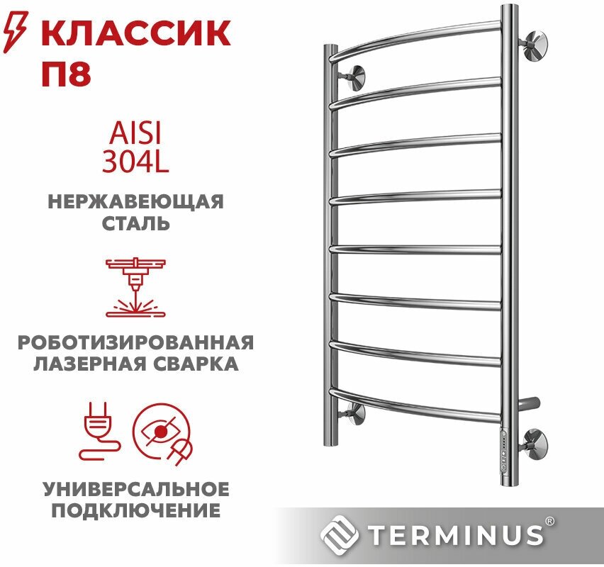 Полотенцесушитель электрический TERMINUS(Терминус) Классик П8 500х850 мм, сверхпрочная нержавеющая сталь, диммер Quick Touch, гарантия 5 лет/ Электрический полотенцесушитель с терморегулятором