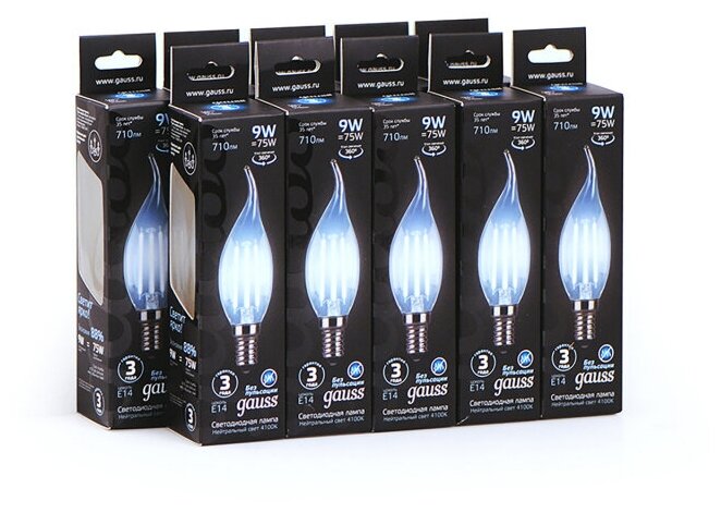 Лампа светодиодная филаментная Filament 9Вт свеча на ветру 4100К нейтр. бел. E14 710лм GAUSS 1048012 интересное: