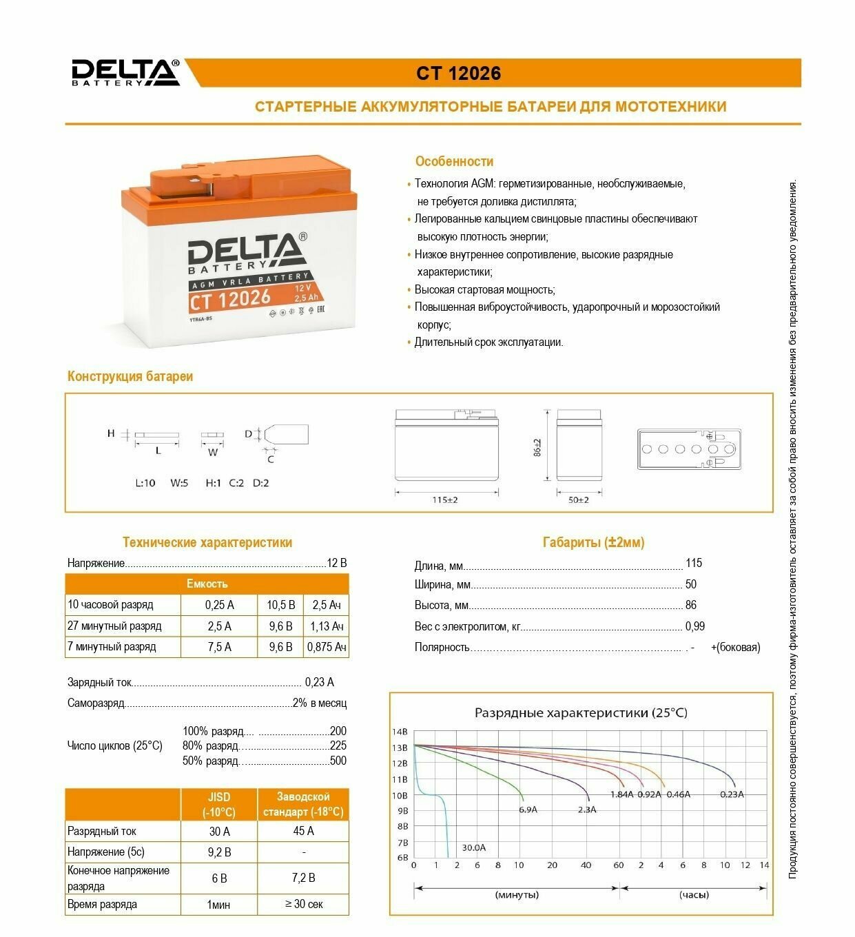 Мото Delta 12В 2,5Ач (Ytr4a-Bs) О/П Д*Ш*В 11,5X5,0X8,6 См Арт. Ct 12026 Delta арт. CT 12026