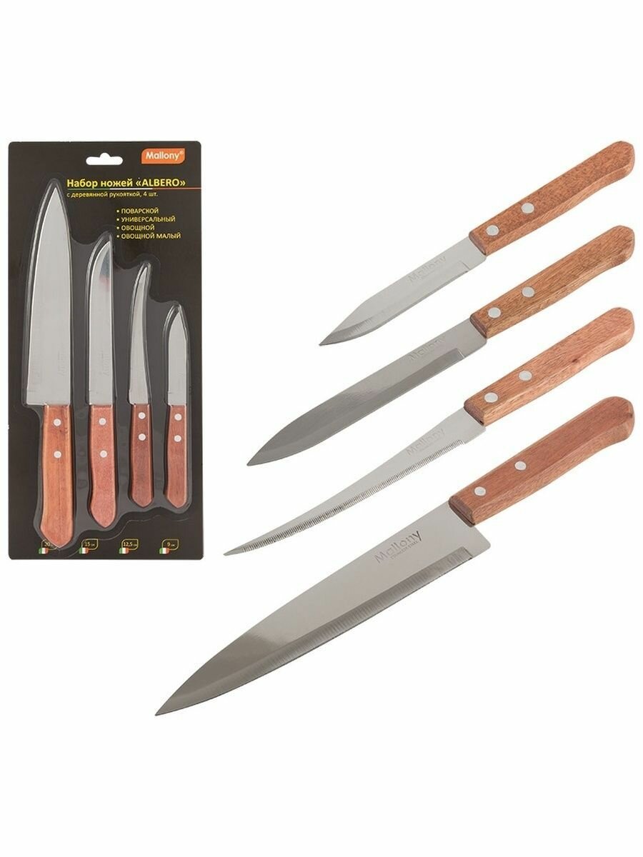 Набор ножей Mallony с деревянной рукояткой ALBERO 4 шт (поварской, универсальный, овощной, овощной малый)