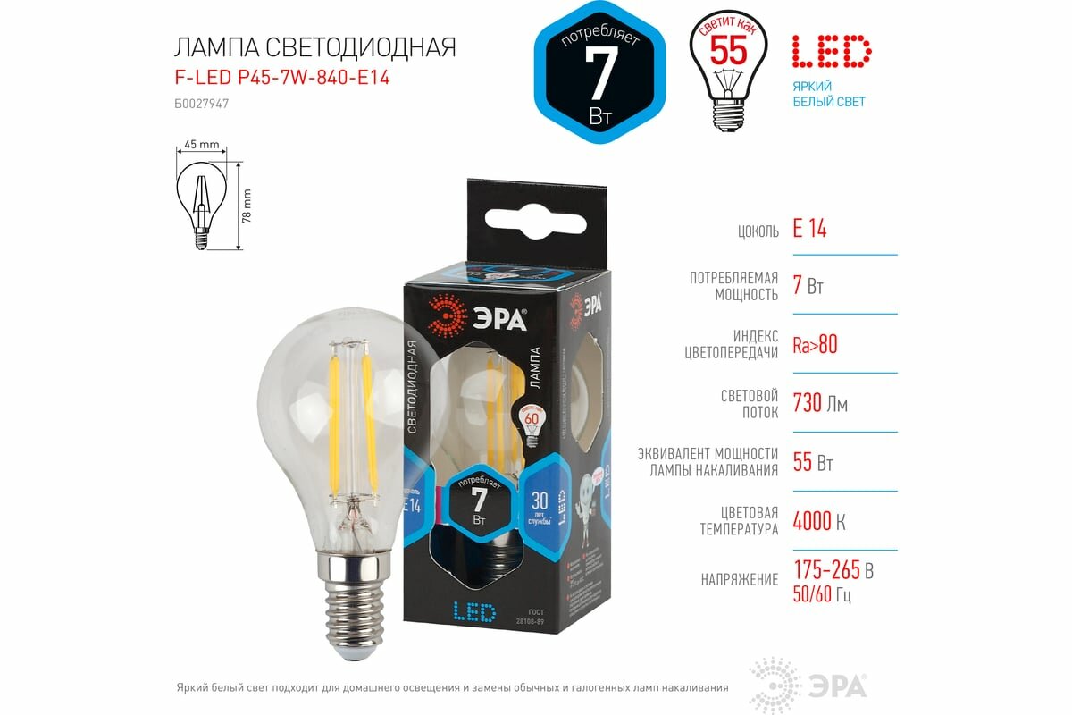 Лампа светодиодная F-LED P45-7w-840-E14, ЭРА Б0027947 (1 шт.)
