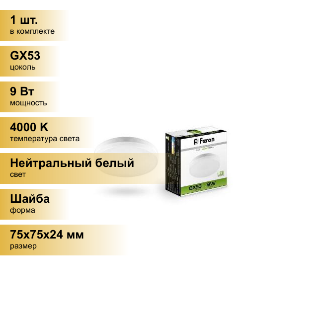 Светодиодная лампа FERON 9W 230V GX53 4000K, LB-452 25829
