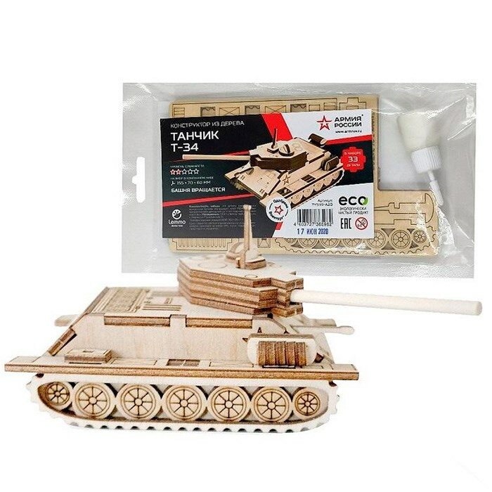 Конструктор деревянный, Танчик Т-34, 38 деталей, Леммо, 1 упаковка