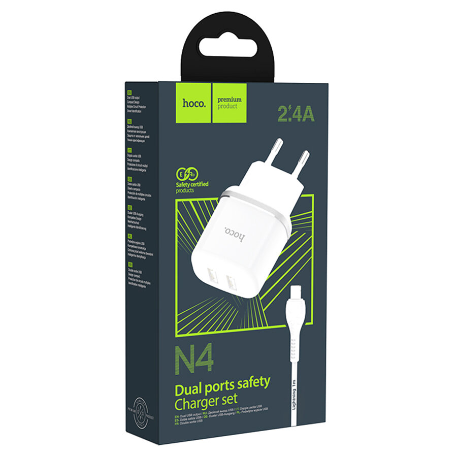Сетевое зарядное устройство + кабель N4 2USB 2.4A 1м белый для iP Lighting HOCO