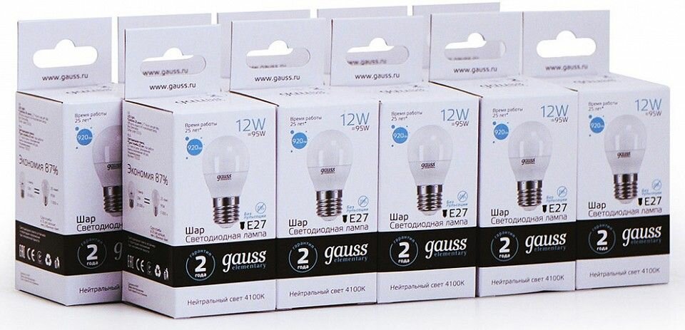 (12 шт.) Светодиодная лампочка Gauss Elementary Шар G45 E27 12W 920lm 4100K 4K 86х45 матовая, пластик/алюм. 53222 Нейтральный белый. Цоколь E27