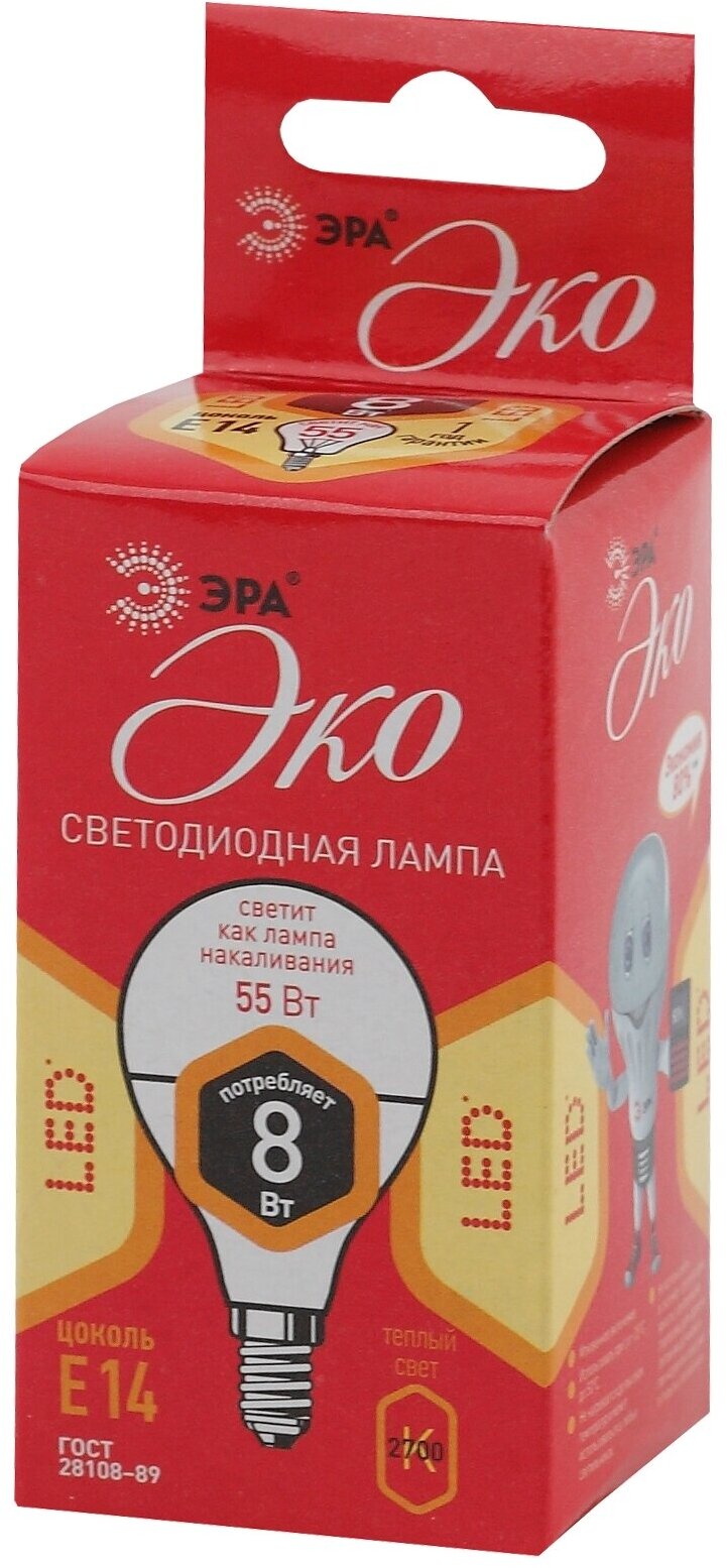 ECO LED P45-8W-827-E14 (диод, шар, 8Вт, тепл, E14), ЭРА Б0030022 (1 шт.)