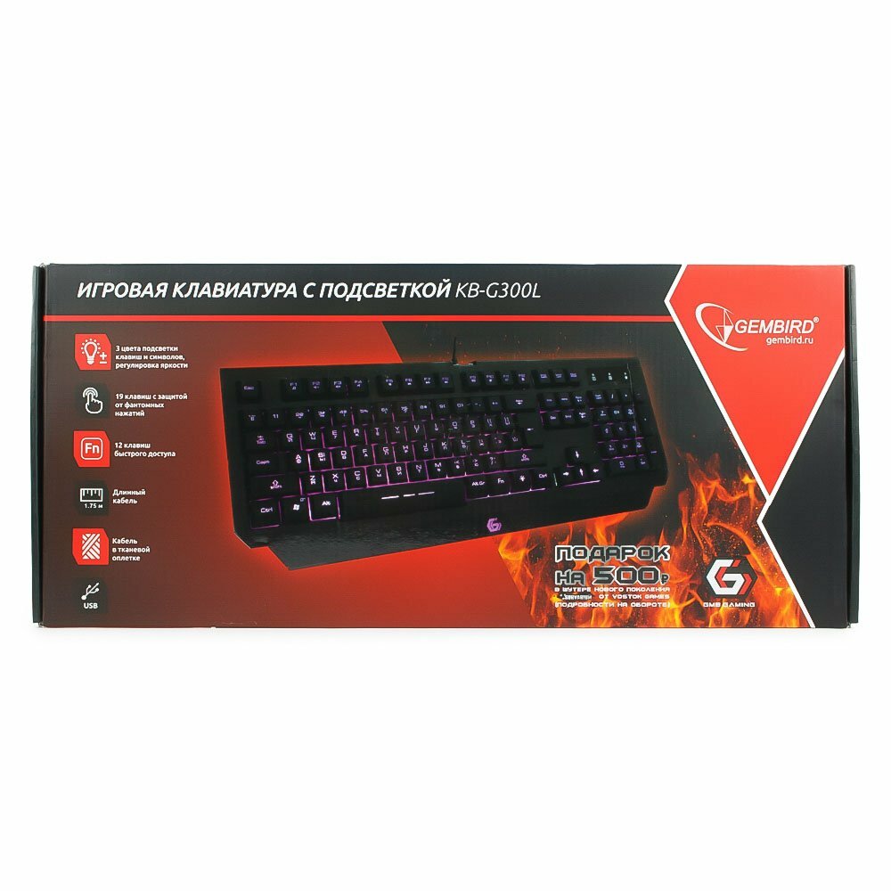 Клавиатура игровая Gembird KB-G300L 104+19кл, подсветка трёхцветная, кабель в тканевой оплётке 1.75 метра, чёрная